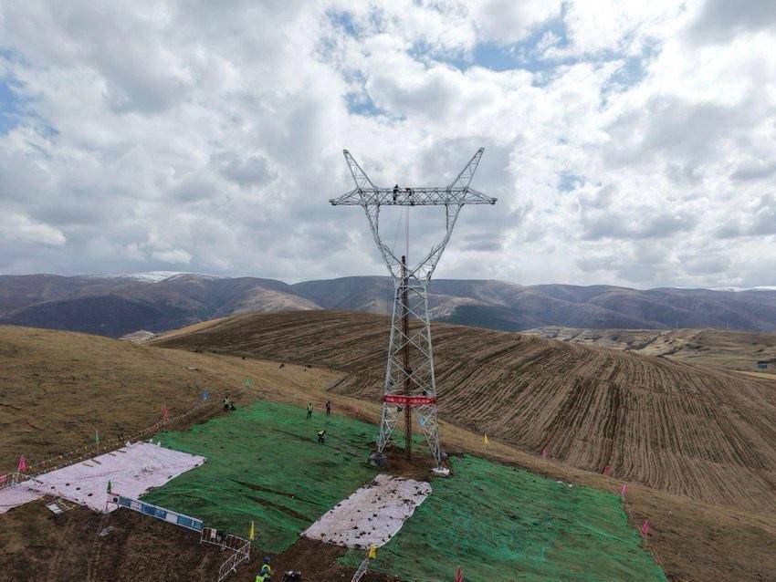 这是阿坝壤塘至阿坝110千伏线路工程的首基铁塔组立现场。首基塔的组立,标志着该项电网工程从基础施工正式转入铁塔组立阶段,为后续全线贯通打下基础。