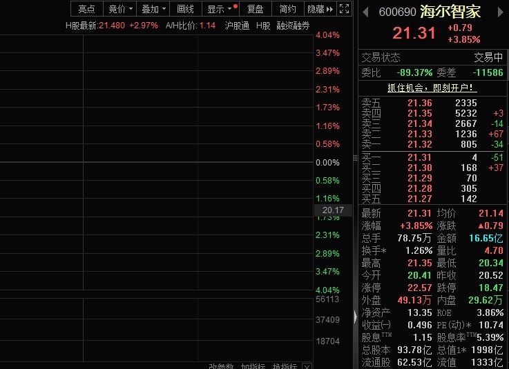 4月28日,海尔智家(600690)股价上涨。截至发稿,股价涨幅近4%。