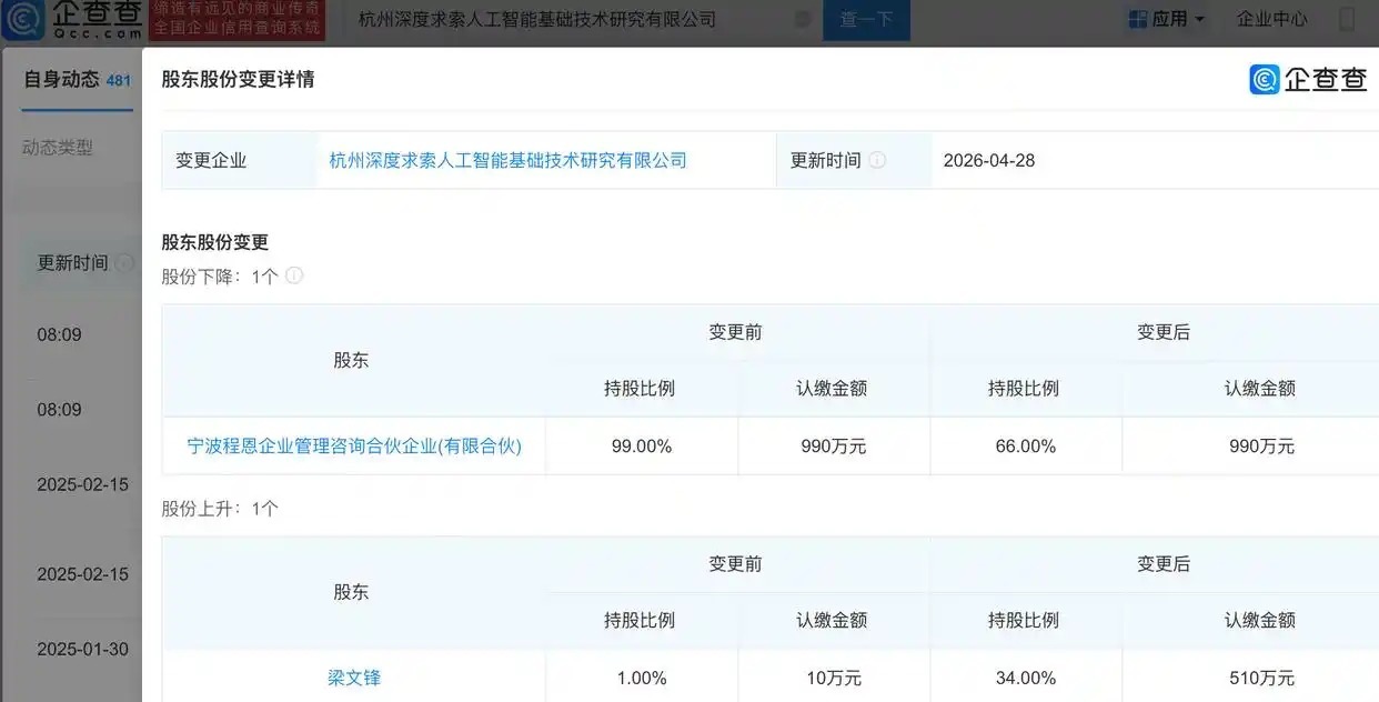 企查查APP显示,近日,DeepSeek关联公司杭州深度求索人工智能基础技术研究有限公司发生工商变更,宁波程恩企业管理咨询合伙企业(有限合伙)持股比例由99%降至66%,创始人梁文锋持股比例由1%升至34%,同时公司注册资本由1000万元增至1500万元,增幅50%。企查查信息显示,该公司成立于2023年,经营范围包含:计算机系统服务;信息系统集成服务;人工智能应用软件开发等,实际控制人为梁文锋。